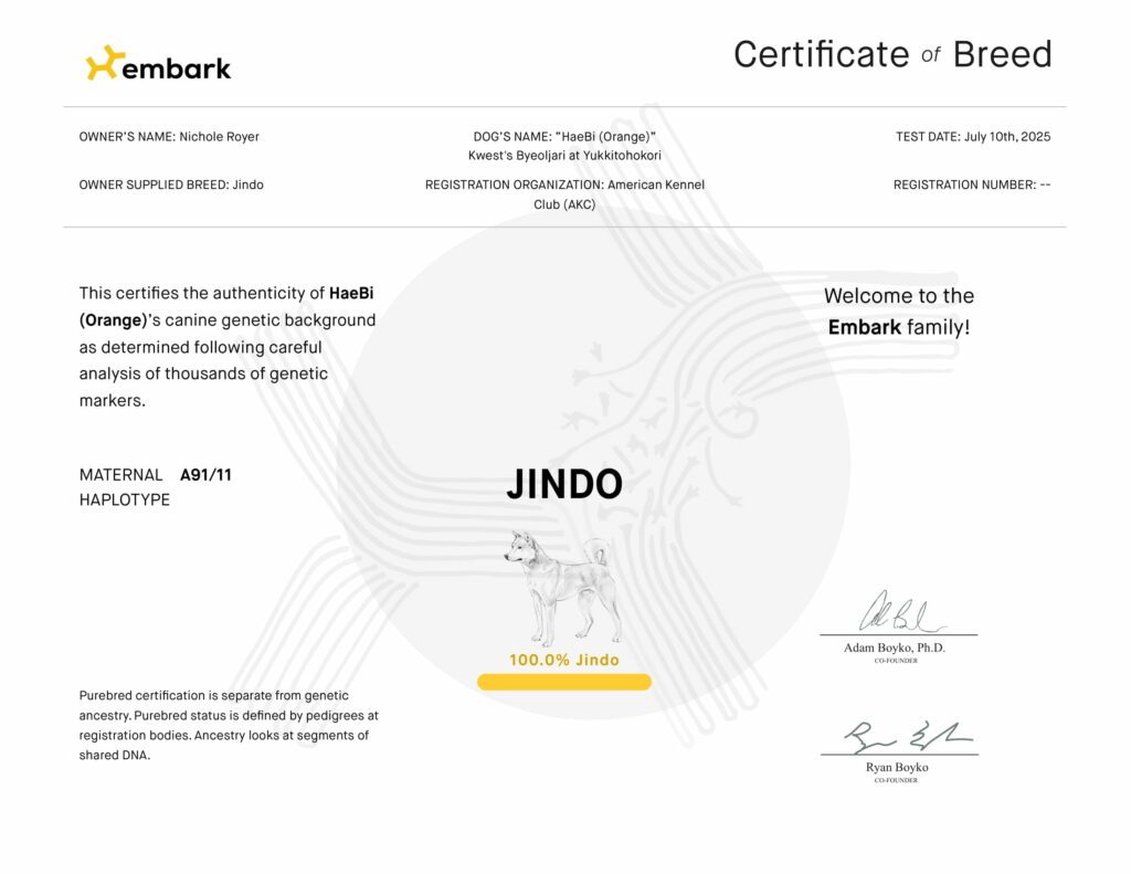 Nazwa zarejestrowana: Kwest’s Byeoljari at Yuukitohokori Imię: HaeBi (promień słońca) Data i miejsce urodzenia: 1.06.2025, USA Mama: BIS IntCh EunHa of Yooshin Kwest CM TKN BCAT FITB TL-1 UL-1 Tata: Cracker Of Yulyeong (IMP KR 🇰🇷) Umaszczenie: rude Wysokość w kłębie: Genotyp: Ayaw, E/E, S/sp, L/L Wirtualny rodowód: TUTAJ