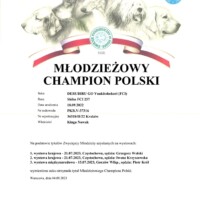 Komentarze sędziów: ładna i wesoła suczka, dobry pigment nosa, oczu i warg, dobrze osadzony i noszony ogon, dobra górna i dolna linia, dobry ruch, trójkątna głowa typowa dla rasy, oczy typowe dla rasy, proporcjonalne ciało, suczy wyraz, szyja dobrej długości, doskonała psychika, pewna siebie z przyjemnym temperamentem, ładna głowa, śnieżnobiałe zęby, prawidłowo noszona szyja, dobrze uformowany tułów, energiczny ruch, bardzo dobrze noszone i osadzone uszy, mocny grzbiet, dobra klatka piersiowa, dobre kątowanie przednich i tylnych nóg, ciemne oczy, typowe pod każdym względem