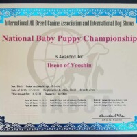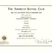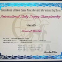 From judges in the USA, Puppy class: top quality puppy, sweet temperament, well proportioned, medium size, coat of excellent texture, well shaped head and eyes, triangle head, dark and almond eyes, well set and used ears, well developed chest for the age, good bone, good rear angulation, tail nicely set into croup, nice trot